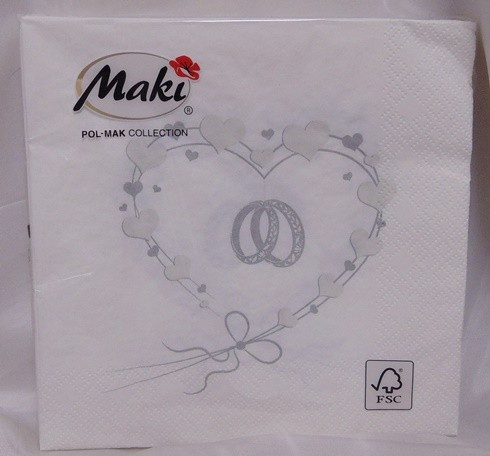 esküvői szalvéta,karikagyűrű szívben, ezüst (33*33), 3 rétegű,