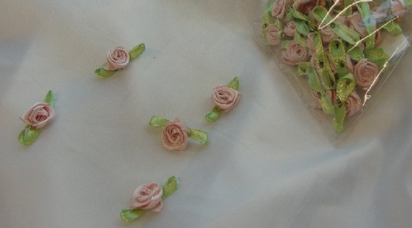 szatén rózsafej levélkével, púderrózsaszín (kb. 50 db)